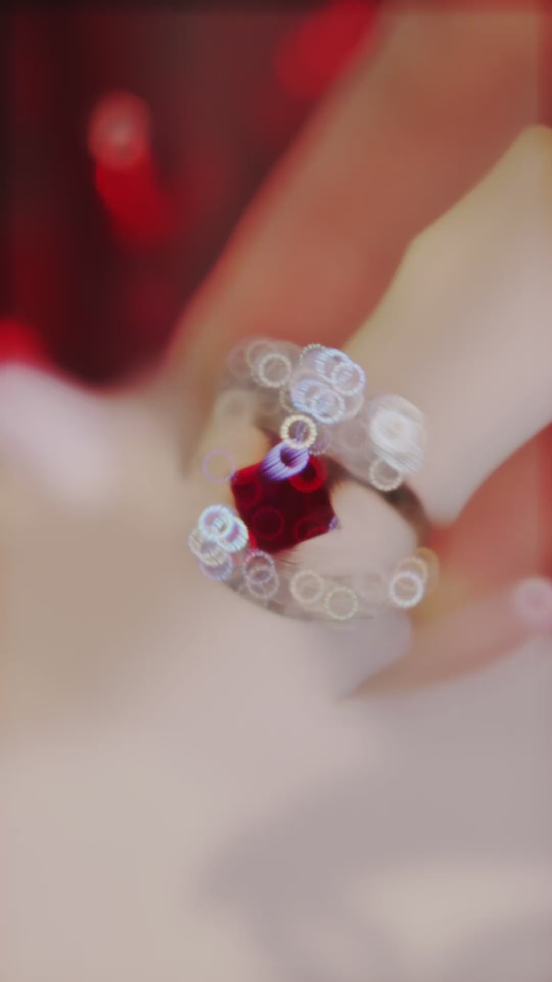 鮮やかな赤いスクエアカットの宝石が印象的な、存在感抜群のリングです。四角くカットされた赤い宝石が、光を受けると深みのある輝きを放ちます。全面に散りばめられたキラキラ光る石が、中央の赤い宝石をさらに引き立てています。シンプルながらも力強いデザインで、カジュアルな服装からフォーマルな装いまで、様々なスタイルに合わせやすいのが特徴。赤い色の情熱的な印象と、上品なデザインのバランスが絶妙です。指を動かすたびにきらめく光が、装いにアクセントを加えてくれます。