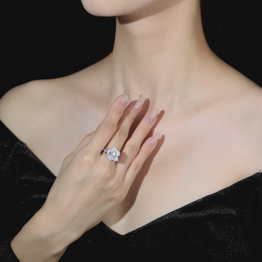 椿をテーマとしており、指輪の上の椿造型は細かくリアルで、透かし彫りや浮き彫りなどの技法を通じて、椿の花びらの紋理と層感を表現しています。満钻の豪華镶嵌技術が一大特徴で、椿の花びらや花芯などの部位には大量の合成ジルコニアが镶嵌されており、密集した镶嵌方式によって、指輪は光の照射を受けるとまばゆい輝きを反射し、非常に強い視覚的なインパクトを与え、華やかで高貴な気質を呈しています。 全体的なデザインはフレンチ風のロマンチックな风情とファッション感を兼ね備えており、日常の着用で優雅な気質を添えるのに適しているだけでなく、特別な場面ではハイライトアクセサリーとして全体の造型の精致度を高めることもできます。