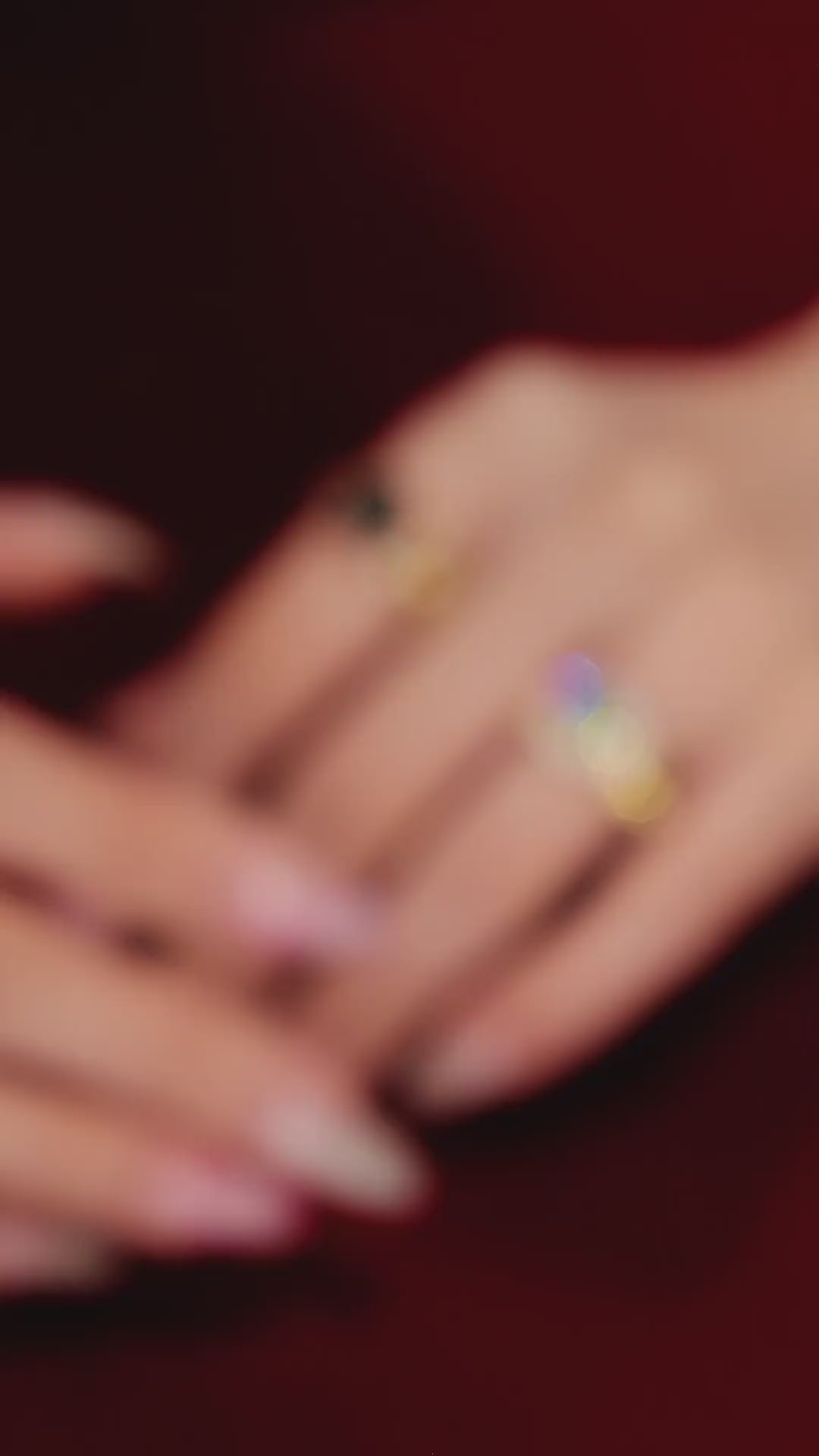 透き通るような美しい青色の卵型の宝石が特徴的で、4本の細い支えが優しく包み込むようなデザインのリングです。宝石の周りには細かい網目模様の装飾が施されていて、光に当たると繊細な影を作り出します。青い宝石は鳩の卵のように柔らかな印象で、見る角度によって色の濃淡が変化するのが魅力。幅広のデザインながら、網目模様のおかげで軽やかな着け心地です。カジュアルな服装からきれいめのコーデまで、様々なスタイルに合わせやすいでしょう。