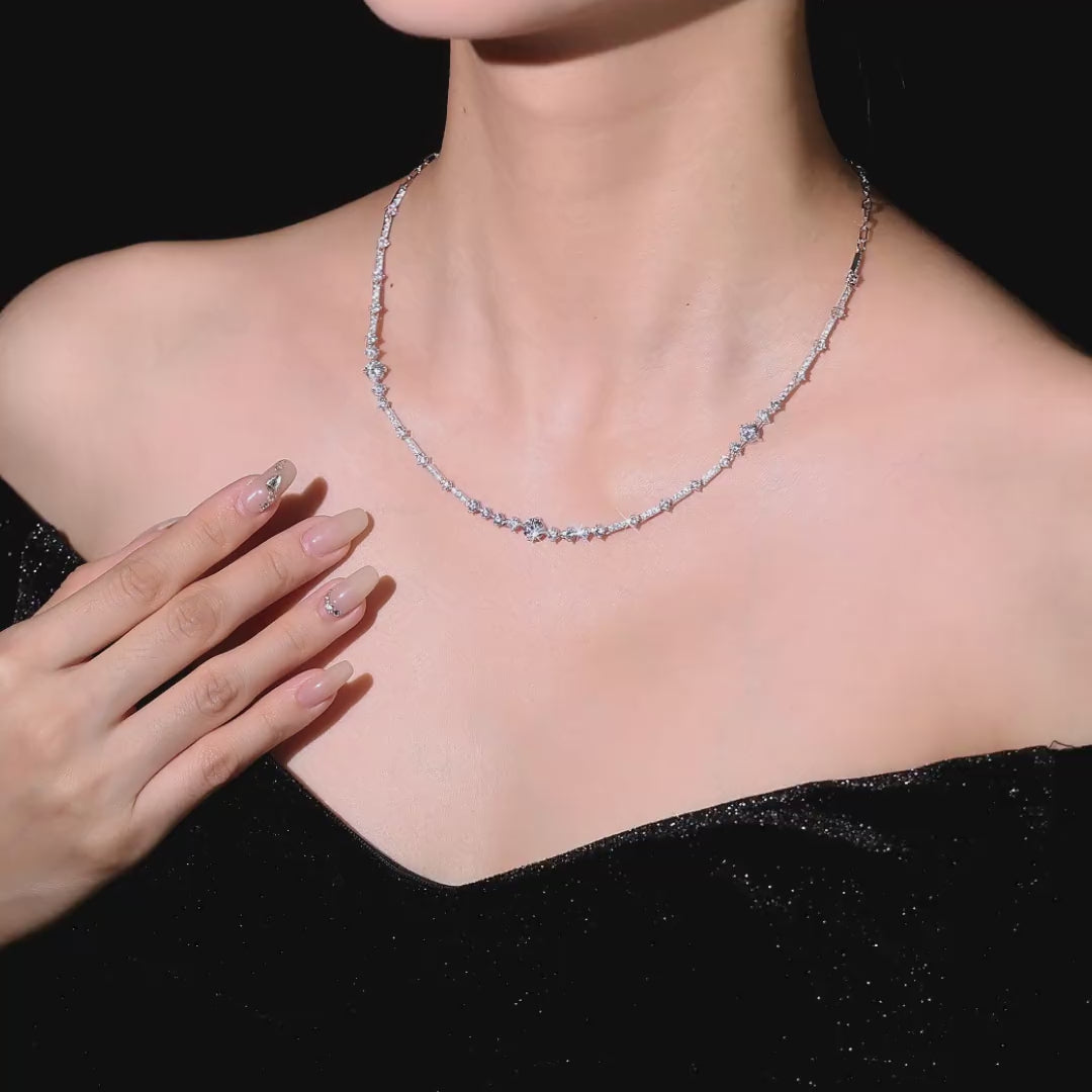 この白いミモザのシンプルなネックレスは、「地味で輝く」をデザイン理念としています。無数の小さな白い宝石が、まるで空に輝く星のように細いチェーンに点在しています。宝石はすべて白く透き通り、配置が適度に疎密を持ち、凝り固まった贅沢感を求めるのではなく、むしろシンプルなレイアウトで生き生きとした雰囲気を表現しています。