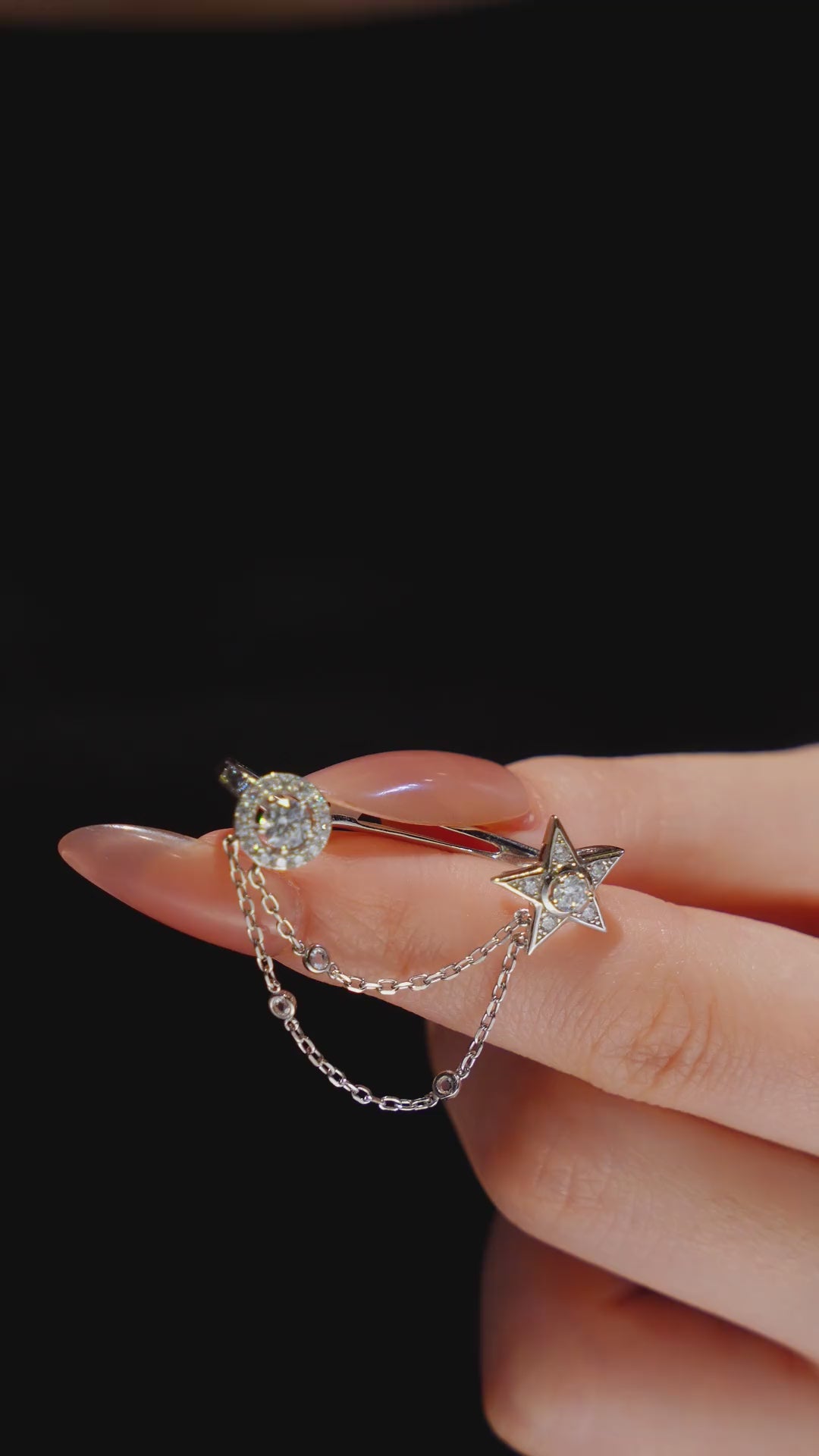 これは、ファッション感と精巧さを兼ね備えたアクセサリーです。本体はピンのような形態のデザインで、素材は銀色調を呈しています。一端は大きな主石が埋め込まれ、周りに小さなダイヤモンドが囲まれた丸い装飾で、もう一端は五角形の造型で、中心にも宝石が埋め込まれています。両者は小さなダイヤモンドが飾られたチェーンでつながっており、チェーンが動き感と層次感を増しています。全体的には星の輝きとチェーンの要素を融合させ、輝き輝いており、デザインには工夫が凝らされています。