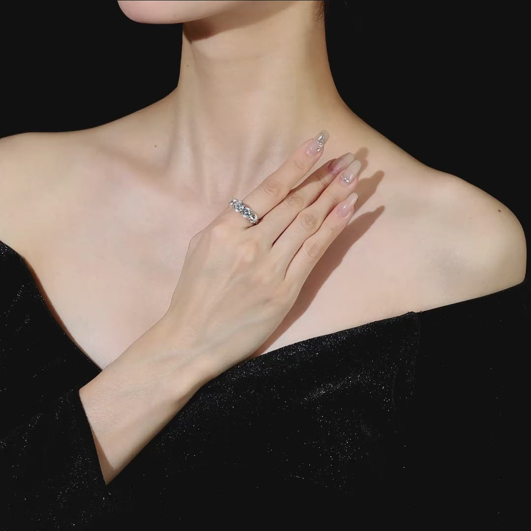 「宇宙の星々の永遠の輝き」をインスピレーションに、五角形の古典的なシンボルを宝石の言葉に変換し、ハイセット工芸を通じて「五星輝き、光芒万丈」の視覚的な張力を表現します。デザインは、幾何学的な構造のスッキリ感とダイヤモンドのマザーセットによる贅沢感の両立を図り、指輪を「指先の星座のトーテム」にします。守りと希望を象徴するだけでなく、輝く形態でダイナーパーティー、祝典などの華やかなシーンにも適しています。