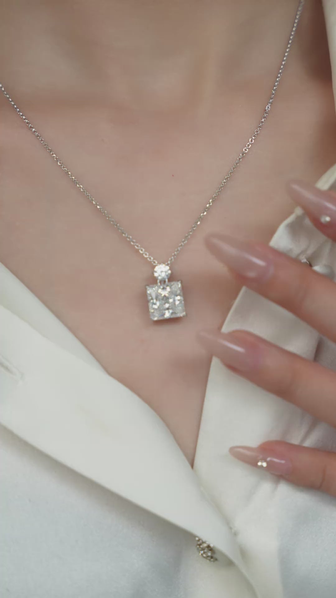 ネックレスの核心部分は独自の氷花カット技術を採用しており、白色のメインストーンを氷晶が咲き誇るような 12 の面に切り出しています。光の屈折により、各稜線から銀河が注ぐような華やかな光りが放たれます。4 爪のモザイクデザインは氷柱が雪片を支えるようで、宝石をしっかりと支えると同時に、スッキリとした極簡主義のラインを描き出し、ダイヤモンドを空中に浮かび上がらせ、生き生きとした視覚効果を演出しています。まるで寒い夜の中で最も純粋な氷花を永遠の輝きに凝固させたかのようです。